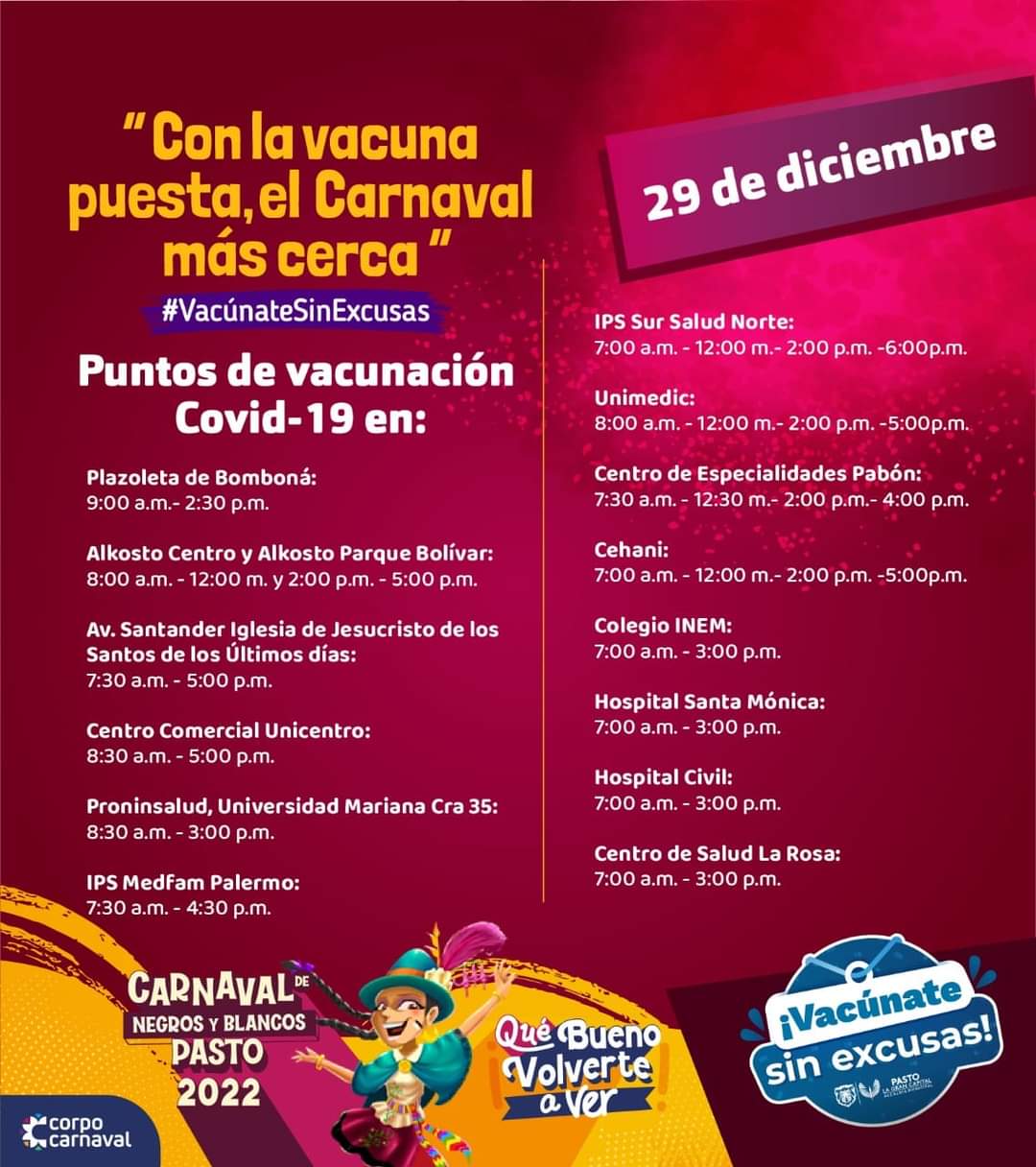 El proceso de vacunación se viene adelantando en los puntos habilitados por las unidades de salud, que corresponden a: los Hospitales Civil, La Rosa y Santa Mónica y en las Instalaciones de la Institución Educativa Municipal, INEM de Pasto, a un costado por el sector del barrio Sumatambo, de lunes a viernes en horario de 7:00 am a 3:00pm; el uno de enero de 2022, no se presta el servicio; el dos de enero de 2022, en el Hospital de Santa Mónica y la IEM-INEM de Pasto, de 7:00 am a 1:00 pm; cinco de enero de 2022, los Hospitales Civil y La Rosa y el seis de enero de 2022, Hospital Santa Mónica y la IEM-INEM de Pasto.